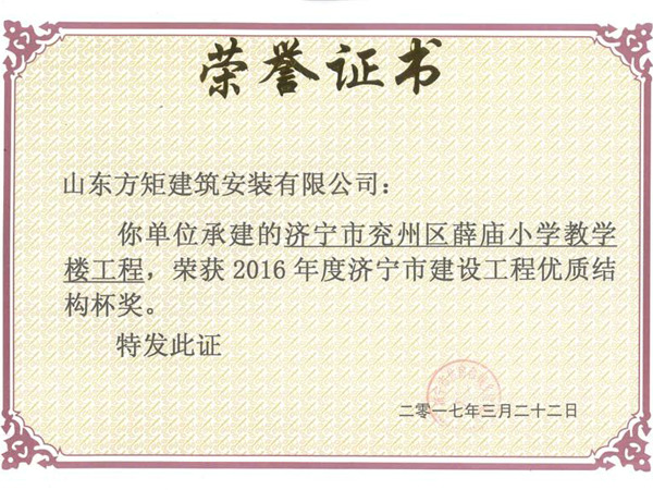 兗州區(qū)薛廟小學(xué)教學(xué)樓工程優(yōu)質(zhì)結(jié)構(gòu)杯獎(jiǎng)